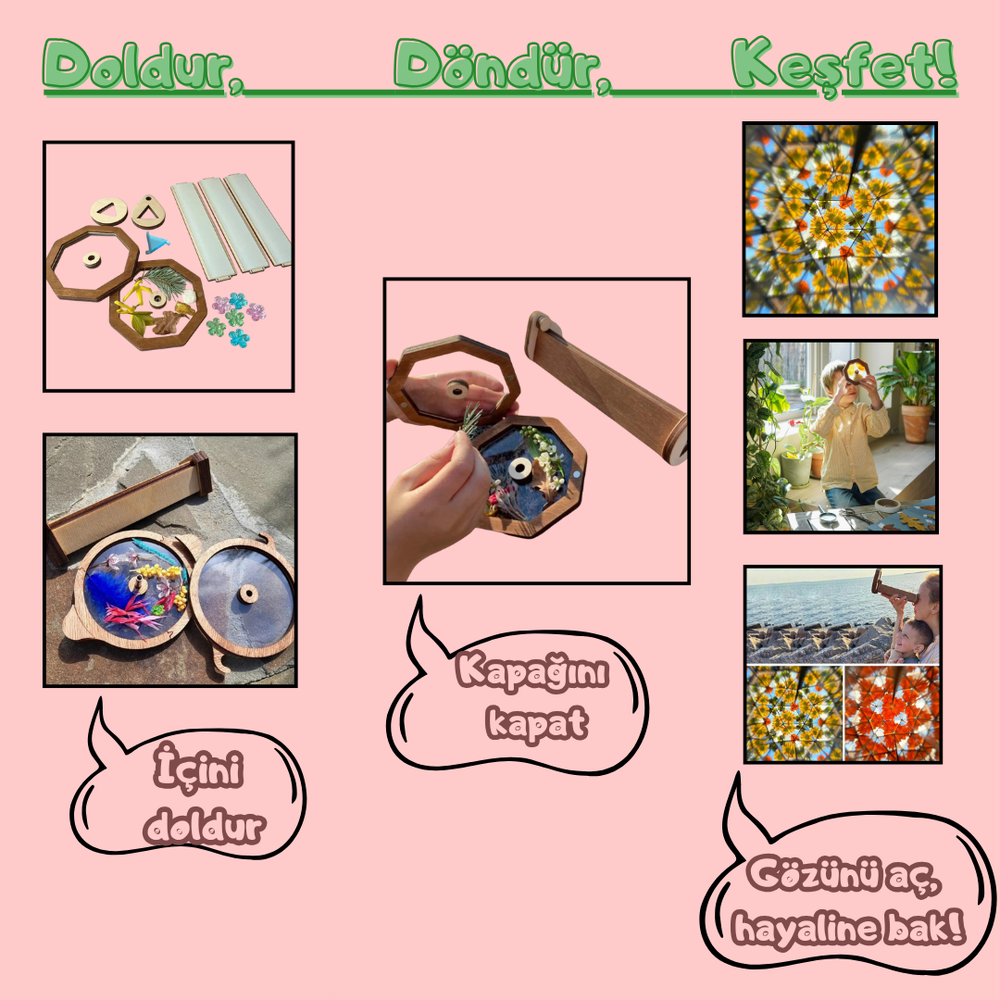 Bak ve Döndür: Kaleydoskopun ucundan bak ve silindiri döndürerek sihirli desenlerin keyfini çıkar!